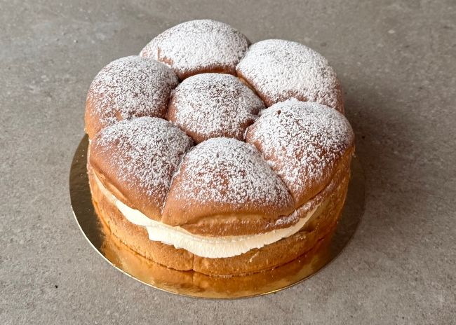 Slät mandelfyllning & vispgrädde som toppas med florsocker